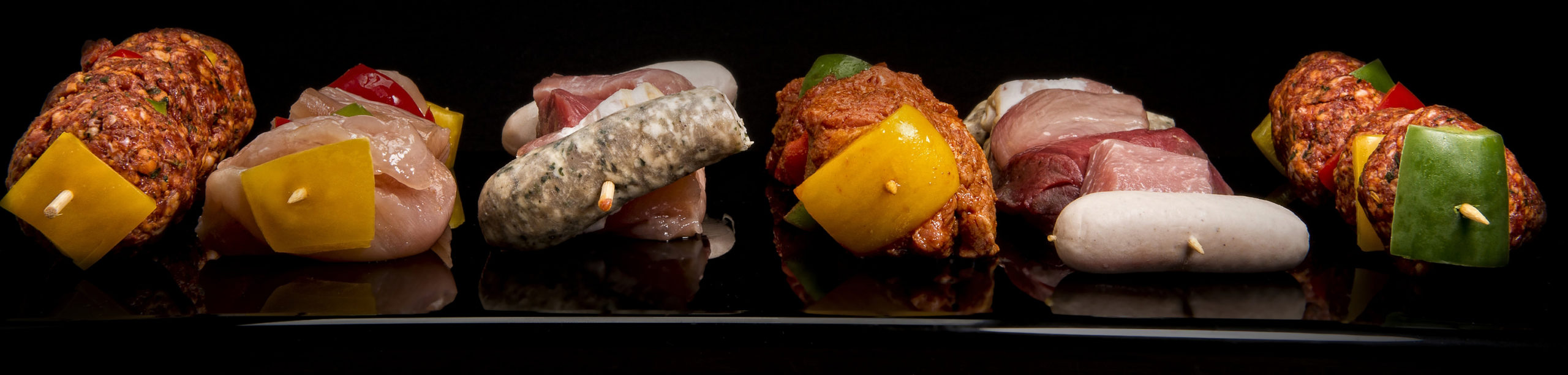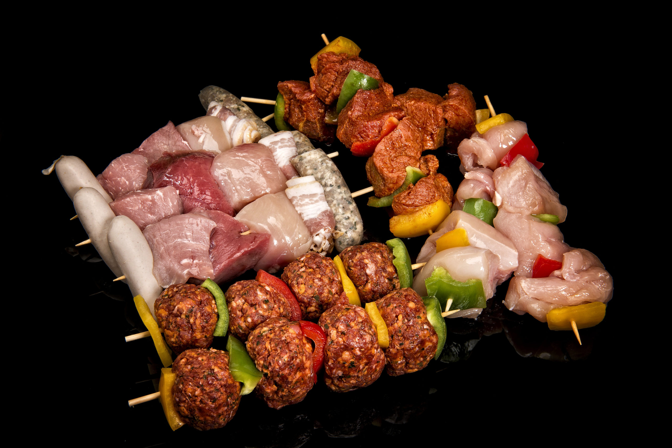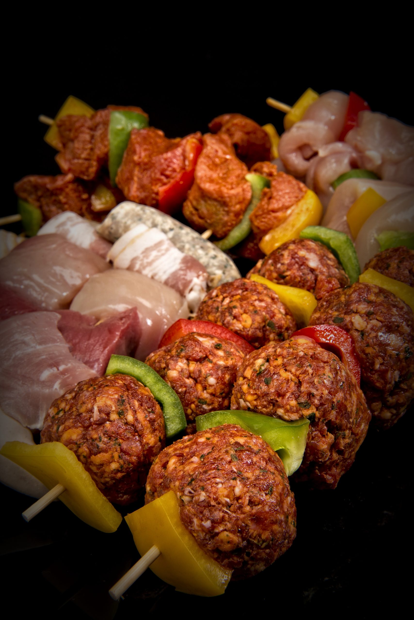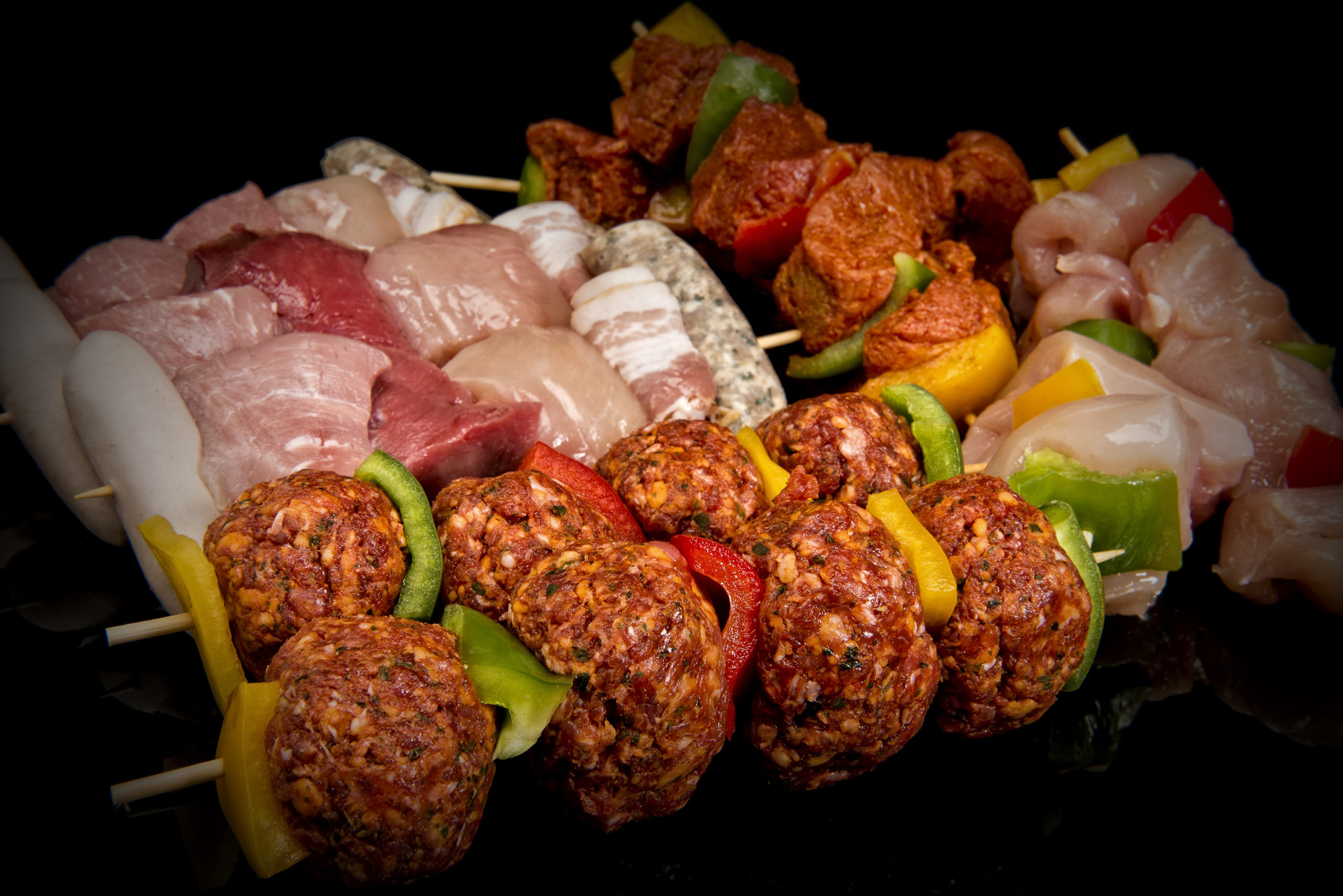 Assortiment de brochettes Mixte, boeuf mexicain, volailles, boulette d’agneau et de boeuf ou encore mignion de porc